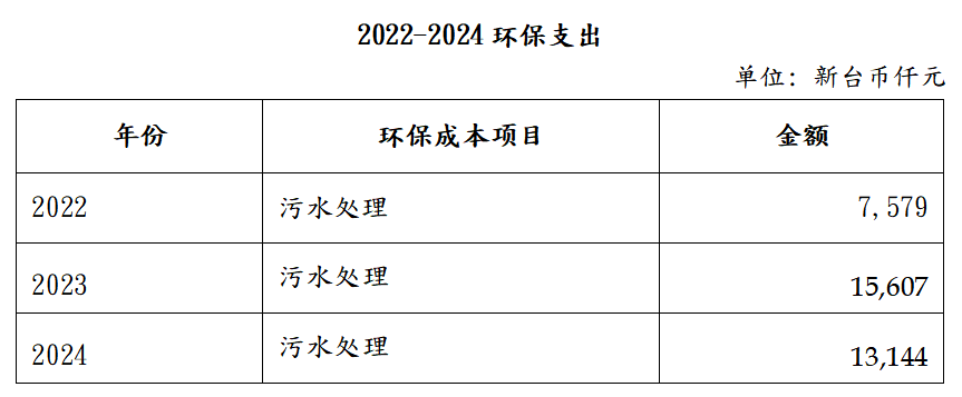 2024年污水处理成本支出为新台币13,144仟元(包含昆山、广东、天津三厂),包括药剂、能耗、人工、固废处置、在线监控等各项投入。